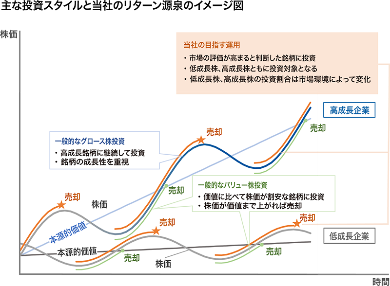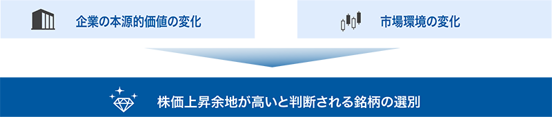 ・そこで当社では、企業の本源的価値を分析するボトムアップ・アプローチと、市場環境の変化を分析するトップダウン・アプローチの両面から、株価上昇余地が高いと判断される銘柄に投資することで、より効率的に超過リターンを獲得できる、と考えています。